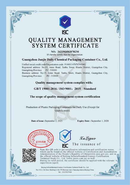 В JJCospack контроль качества лежит в основе нашего производственного процесса. Мы работаем по сертифицированной Системе менеджмента качества, обеспечивая стандартизированные процедуры, стабильное качество продукции и постоянное совершенствование всех операций.